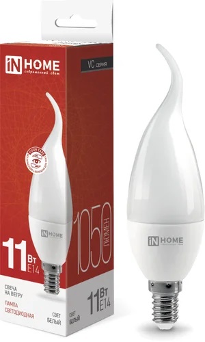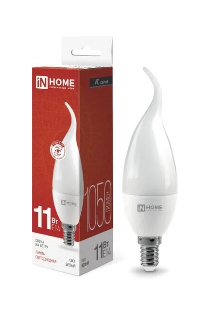 Светодиодная лампа IN HOME LED-СВЕЧА НА ВЕТРУ-VC 11Вт 230В Е14 4000К с формой колбы «свеча на ветру» – бесспорный фаворит любителей классических интерьеров, а технология «Vision Care» делает ее привлекательной для всех, кто хочет сохранить здоровое зрение. Матовая светодиодная лампа излучает ровный, комфортный для глаз свет без пульсации и мерцания. Яркая LED-лампа 11 Вт E14, 1050 Лм, 4000К, долговечная, экономичная, матовая, идеальна для дома, офиса, бра и люстр. Безопасна для зрения.