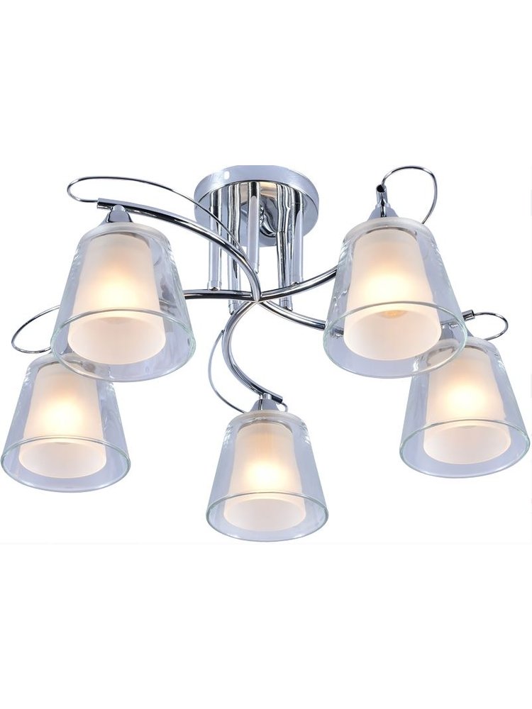 Создайте стильное и яркое освещение в своём доме или офисе с универсальной потолочной люстрой на 5 ламп с цоколем E27. Идеальное решение для гостиных, спален, столовых и рабочих кабинетов благодаря гармоничному сочетанию классического хромированного корпуса и элегантных плафонов, которые мягко рассеивают свет, обеспечивая равномерное освещение пространства до 18 кв.м.