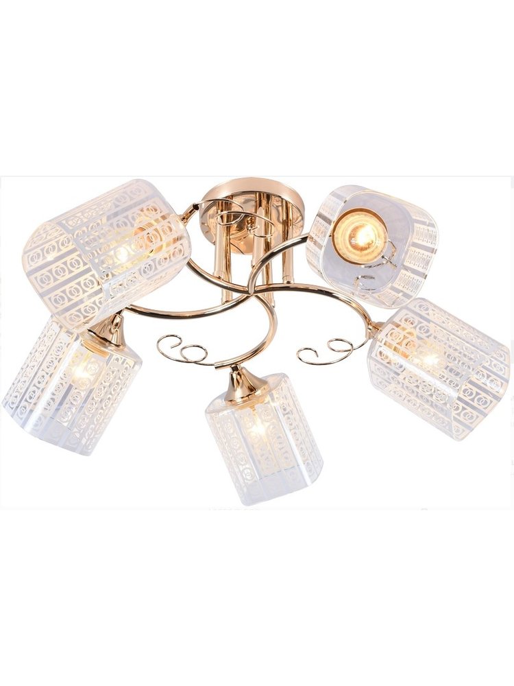 Элегантное решение для любого интерьера — идеальный выбор для жилых комнат, офисов, гостиниц, кафе и залов. Пять ламп обеспечивают мощное, равномерное освещение, а изысканная отделка под золото придает помещению респектабельный вид и подчеркивает современный стиль.