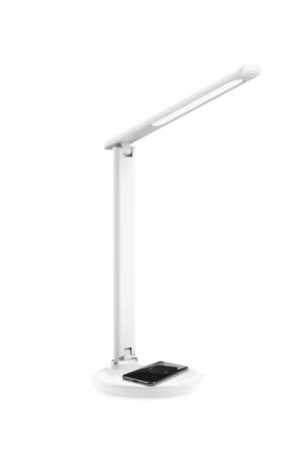 Настольная лампа с сенсорным управлением, светодиодным светом и функцией беспроводной зарядки устройств Qi-стандарта, белый цвет.