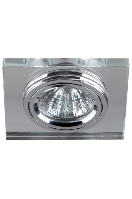 Максимальная мощность лампы – 50 Вт. Корпус встраиваемого светильника изготовлен из алюминия. Диаметр отверстия, требуемого для установки светильника составляет 65 мм, а размер самого светильника – 90 мм. Встраиваемый светильник стекло/хром, 50 Вт MR16, под 12V/220V, стильное оформление, легко монтируется, подходит для любых помещений.