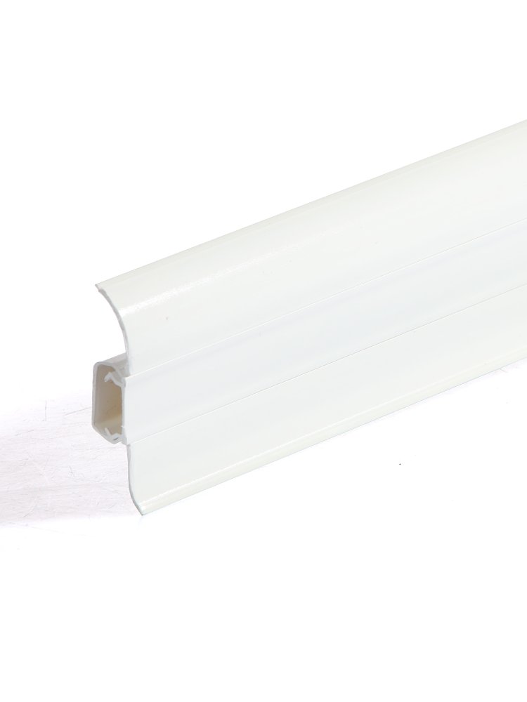 Утонченный и высокий профиль (58 мм) с острыми краями. Благодаря съёмной панели монтаж электрических проводов, покраска стен, оклеивание обоями возможны без демонтажа профилей. Конструкция позволяет монтировать и демонтировать плинтус без использования инструментов. Существует возможность размещения большого количества проводов, в том числе после монтажа. Специальная двухслойная технология: помимо слоя краски, дополнительно покрывается специальным лаком, благодаря чему его покрытие становится однородным, а это дополнительно защищает изделие от разного вида механических повреждений и вредного воздействия лучей УФ. Благодаря эластичному материалу, плинтус идеально прилегает даже к неровностям стен и полов. Белый пластиковый плинтус 58 мм, длина 2,2 м, скрывает кабели, устойчив к влаге и механическим воздействиям, легко монтируется и долговечен.