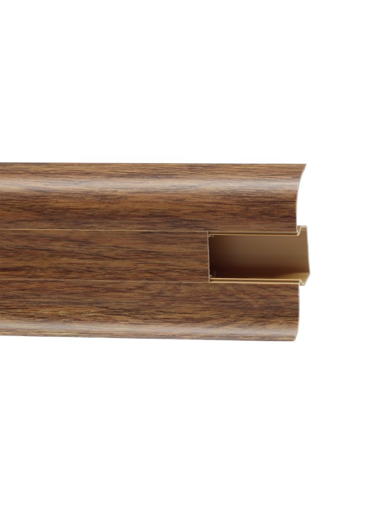 Утонченный и высокий профиль (58 мм) с острыми краями. Благодаря съёмной панели монтаж электрических проводов, покраска стен, оклеивание обоями возможны без демонтажа профилей. Конструкция позволяет монтировать и демонтировать плинтус без использования инструментов. Существует возможность размещения большого количества проводов, в том числе после монтажа. Специальная двухслойная технология: помимо слоя краски, дополнительно покрывается специальным лаком, благодаря чему его покрытие становится однородным, а это дополнительно защищает изделие от разного вида механических повреждений и вредного воздействия лучей УФ. Благодаря эластичному материалу, плинтус идеально прилегает даже к неровностям стен и полов. Плинтус маскирует стыки пола и стены, подходит под кабель-канал, влагостойкий, высота 58 мм, длина 2,5 м, легкая установка.