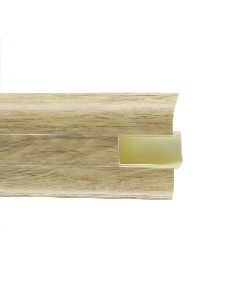 Утонченный и высокий профиль (58 мм) с острыми краями. Благодаря съёмной панели монтаж электрических проводов, покраска стен, оклеивание обоями возможны без демонтажа профилей. Конструкция позволяет монтировать и демонтировать плинтус без использования инструментов. Существует возможность размещения большого количества проводов, в том числе после монтажа. Специальная двухслойная технология: помимо слоя краски, дополнительно покрывается специальным лаком, благодаря чему его покрытие становится однородным, а это дополнительно защищает изделие от разного вида механических повреждений и вредного воздействия лучей УФ. Благодаря эластичному материалу, плинтус идеально прилегает даже к неровностям стен и полов. Износостойкий плинтус 58 мм с каналом для кабеля, длина 2,5 м, влагоустойчив, дизайн под дуб. Идеален для чистой и аккуратной отделки пола.