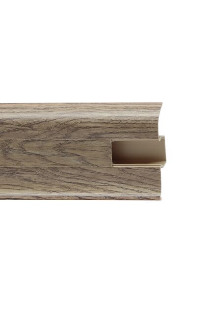 Утонченный и высокий профиль (58 мм) с острыми краями. Благодаря съёмной панели монтаж электрических проводов, покраска стен, оклеивание обоями возможны без демонтажа профилей. Конструкция позволяет монтировать и демонтировать плинтус без использования инструментов. Существует возможность размещения большого количества проводов, в том числе после монтажа. Специальная двухслойная технология: помимо слоя краски, дополнительно покрывается специальным лаком, благодаря чему его покрытие становится однородным, а это дополнительно защищает изделие от разного вида механических повреждений и вредного воздействия лучей УФ. Благодаря эластичному материалу, плинтус идеально прилегает даже к неровностям стен и полов. Эстетичный и практичный плинтус 58мм цвета дуба, 2,5м длины, защищает стены, скрывает провода, легко монтируется и подходит для любого интерьера.