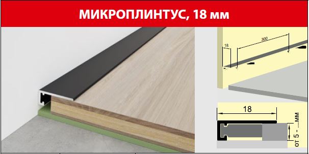Применяется для установки на паркетную доску, пробковые полы клеевые и замковые, ламинат, SPC толщиной от 5мм. Позволяет практично и легко закрыть зазор между стеной и напольным покрытием. Для установки микроплинтуса не требуется креплений к стене. Отделка стен должна быть завершена, напольное покрытие уложено. Комплектуется 8-ми пружинами для установки. Прочный алюминиевый микроплинтус 18 мм, длина 2,4 м, поверхность под дуб хельсинки. Устойчив к повреждениям и легко устанавливается.