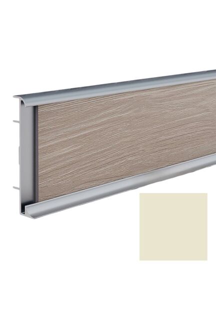 Используется для ровных стен. Имеет пазы для вставки элемента напольного покрытия. Крепится на саморезы. Умеренно гибкий. Прочный алюминиевый плинтус 60мм с покрытием RAL 1013 муар — оптимален для коммерческих полов, легко монтируется и долговечен.