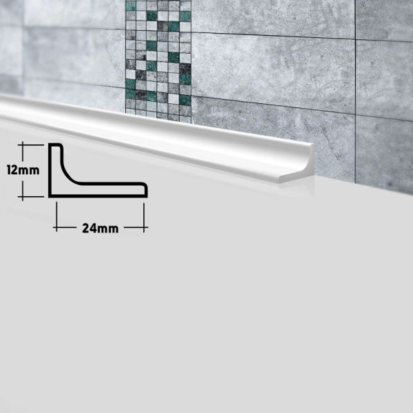 Служит для скрытия стыков между раковиной или ванной и стеной. Акриловый камень, из которого сделаны бордюры, очень плотный и прочный материал. В нем нет пор, поэтому в нём не заводятся плесень и грибок. Он прост в уходе, не боится влажности и бытовой химии, не меняет свой цвет и форму. Для распила потребуется ножовка по металлу или торцовочная пила с диском по дереву или алюминию, монтаж производится на герметик или водостойкий клей. Влагостойкий, акриловый бордюр для герметизации стыков, белый, 12×24×1800 мм. Лёгкий монтаж, защита от плесени и эстетичный внешний вид.
