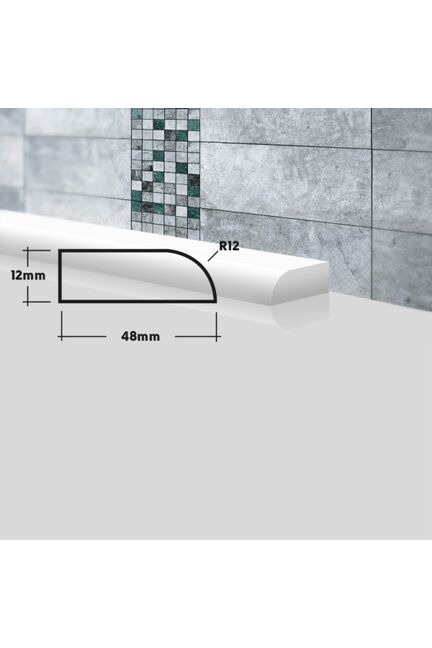 Служит для скрытия стыков между раковиной или ванной и стеной. Акриловый камень, из которого сделаны бордюры, очень плотный и прочный материал. В нем нет пор, поэтому в нём не заводятся плесень и грибок. Он прост в уходе, не боится влажности и бытовой химии, не меняет свой цвет и форму. Для распила потребуется ножовка по металлу или торцовочная пила с диском по дереву или алюминию, монтаж производится на герметик или водостойкий клей. Герметичный акриловый бордюр, стойкий к влаге и плесени, легко монтируется, скрывает стыки, создаёт аккуратный  внешний вид.