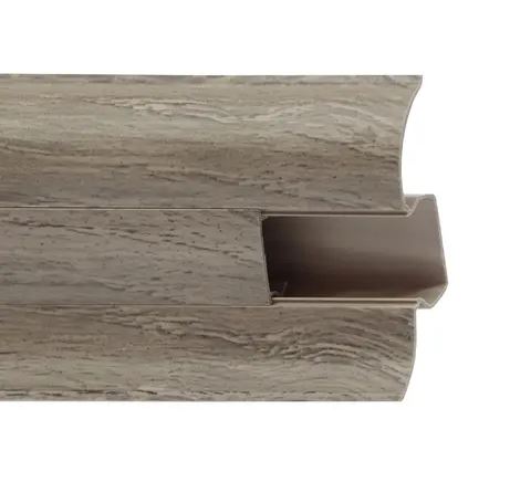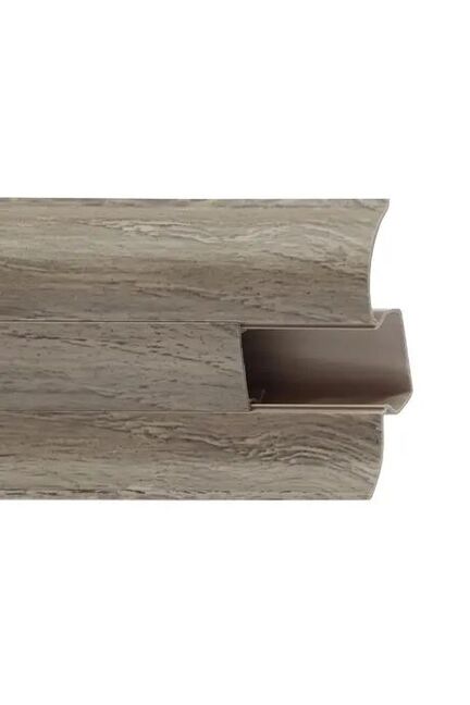 Утонченный и высокий профиль (58 мм) с острыми краями. Благодаря съёмной панели монтаж электрических проводов, покраска стен, оклеивание обоями возможны без демонтажа профилей. Конструкция позволяет монтировать и демонтировать плинтус без использования инструментов. Существует возможность размещения большого количества проводов, в том числе после монтажа. Специальная двухслойная технология: помимо слоя краски, дополнительно покрывается специальным лаком, благодаря чему его покрытие становится однородным, а это дополнительно защищает изделие от разного вида механических повреждений и вредного воздействия лучей УФ. Благодаря эластичному материалу, плинтус идеально прилегает даже к неровностям стен и полов. Аккуратное соединение плинтусов, стильная расцветка — дуб Шервуд, монтаж без инструментов. В упаковке 2 штуки —  для идеального стыка и долгой службы.