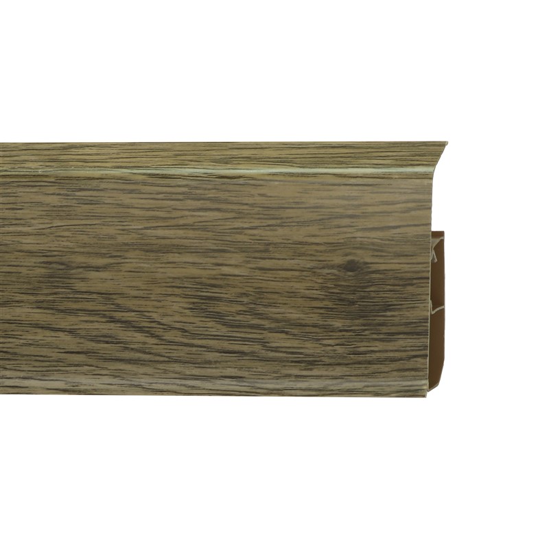 Утонченный и высокий профиль (80 мм) с острыми краями. Благодаря съёмной панели монтаж электрических проводов, покраска стен, оклеивание обоями возможны без демонтажа профилей. Конструкция позволяет монтировать и демонтировать плинтус без использования инструментов. Существует возможность размещения большого количества проводов, в том числе после монтажа. Специальная двухслойная технология: помимо слоя краски, дополнительно покрывается специальным лаком, благодаря чему его покрытие становится однородным, а это дополнительно защищает изделие от разного вида механических повреждений и вредного воздействия лучей УФ. Благодаря эластичному материалу, плинтус идеально прилегает даже к неровностям стен и полов.