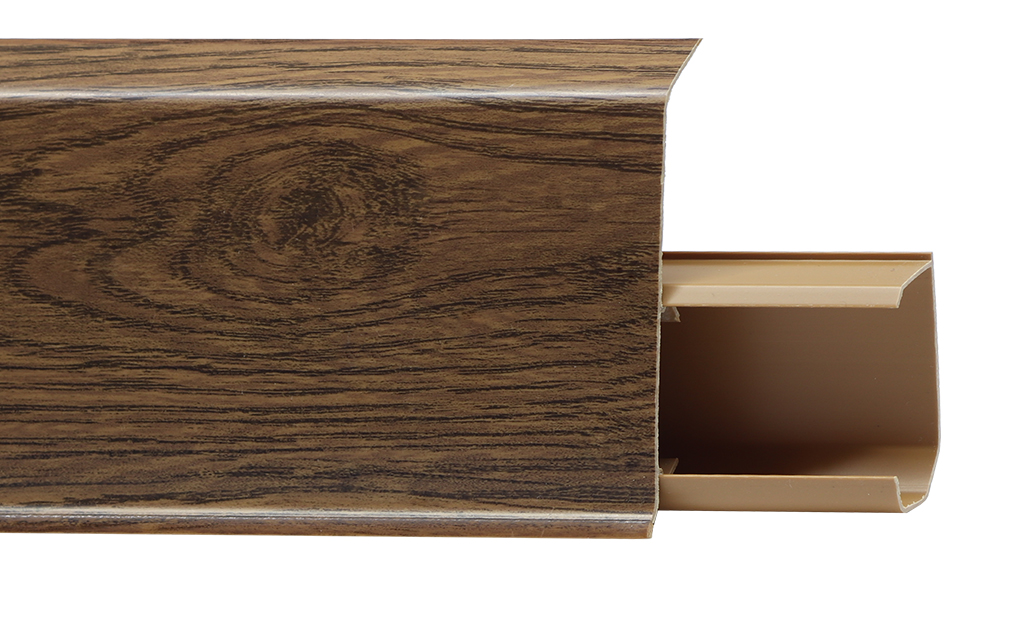 Утонченный и высокий профиль (72 мм) с острыми краями. Благодаря съёмной панели монтаж электрических проводов, покраска стен, оклеивание обоями возможны без демонтажа профилей. Конструкция позволяет монтировать и демонтировать плинтус без использования инструментов. Существует возможность размещения большого количества проводов, в том числе после монтажа. Специальная двухслойная технология: помимо слоя краски, дополнительно покрывается специальным лаком, благодаря чему его покрытие становится однородным, а это дополнительно защищает изделие от разного вида механических повреждений и вредного воздействия лучей УФ. Благодаря эластичному материалу, плинтус идеально прилегает даже к неровностям стен и полов.