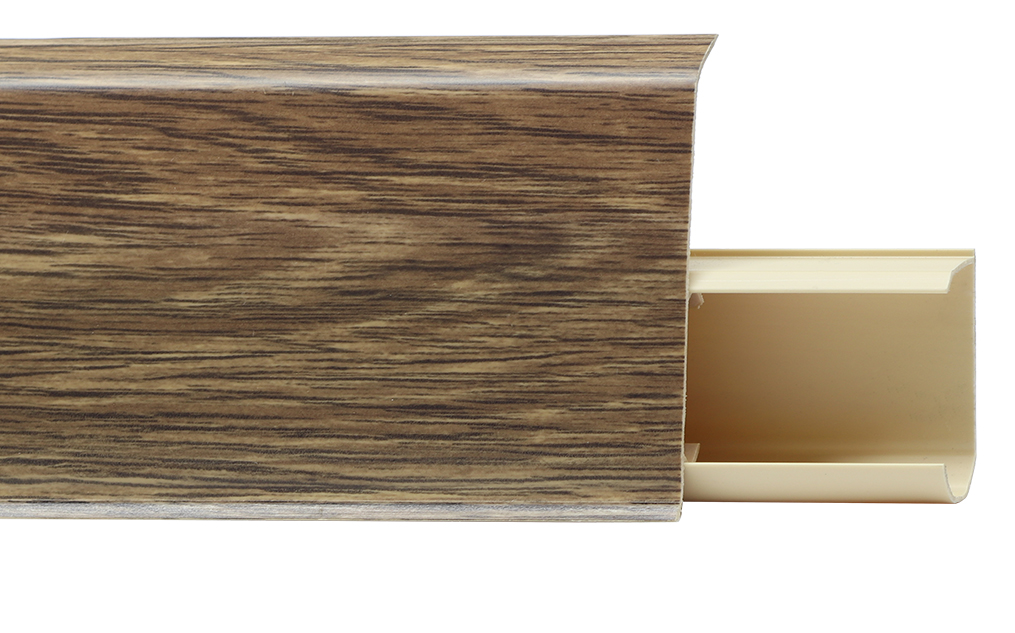 Утонченный и высокий профиль (72 мм) с острыми краями. Благодаря съёмной панели монтаж электрических проводов, покраска стен, оклеивание обоями возможны без демонтажа профилей. Конструкция позволяет монтировать и демонтировать плинтус без использования инструментов. Существует возможность размещения большого количества проводов, в том числе после монтажа. Специальная двухслойная технология: помимо слоя краски, дополнительно покрывается специальным лаком, благодаря чему его покрытие становится однородным, а это дополнительно защищает изделие от разного вида механических повреждений и вредного воздействия лучей УФ. Благодаря эластичному материалу, плинтус идеально прилегает даже к неровностям стен и полов.