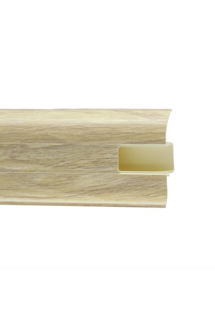 Утонченный и высокий профиль (58 мм) с острыми краями. Благодаря съёмной панели монтаж электрических проводов, покраска стен, оклеивание обоями возможны без демонтажа профилей. Конструкция позволяет монтировать и демонтировать плинтус без использования инструментов. Существует возможность размещения большого количества проводов, в том числе после монтажа. Специальная двухслойная технология: помимо слоя краски, дополнительно покрывается специальным лаком, благодаря чему его покрытие становится однородным, а это дополнительно защищает изделие от разного вида механических повреждений и вредного воздействия лучей УФ. Благодаря эластичному материалу, плинтус идеально прилегает даже к неровностям стен и полов.