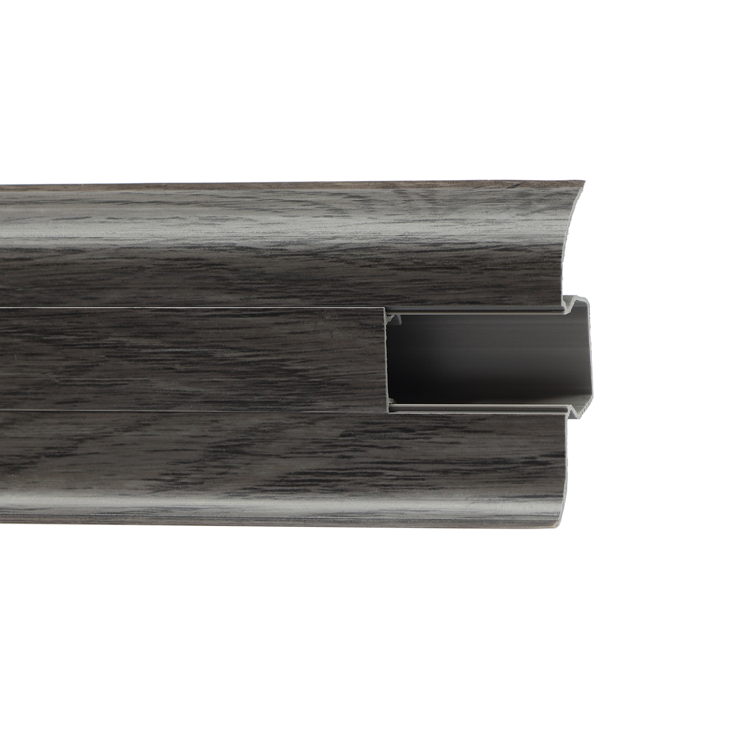 Утонченный и высокий профиль (58 мм) с острыми краями. Благодаря съёмной панели монтаж электрических проводов, покраска стен, оклеивание обоями возможны без демонтажа профилей. Конструкция позволяет монтировать и демонтировать плинтус без использования инструментов. Существует возможность размещения большого количества проводов, в том числе после монтажа. Специальная двухслойная технология: помимо слоя краски, дополнительно покрывается специальным лаком, благодаря чему его покрытие становится однородным, а это дополнительно защищает изделие от разного вида механических повреждений и вредного воздействия лучей УФ. Благодаря эластичному материалу, плинтус идеально прилегает даже к неровностям стен и полов.