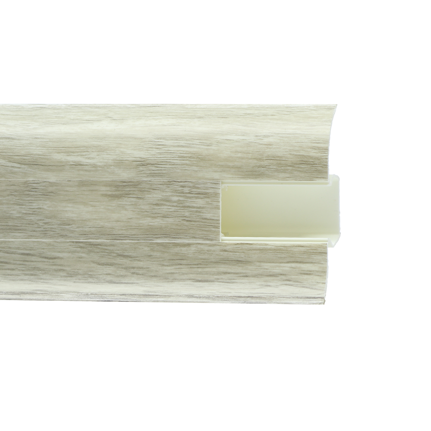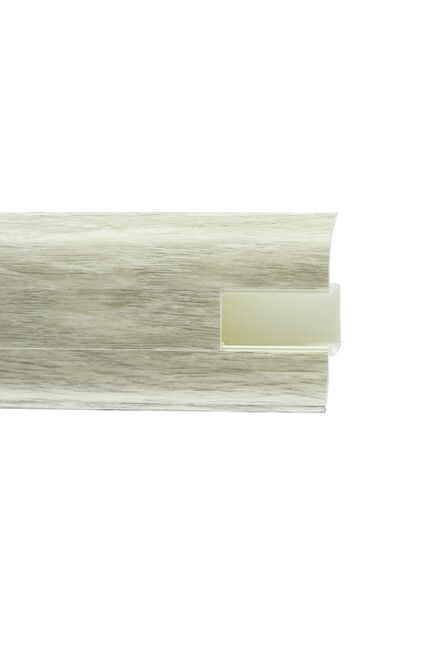 Утонченный и высокий профиль (58 мм) с острыми краями. Благодаря съёмной панели монтаж электрических проводов, покраска стен, оклеивание обоями возможны без демонтажа профилей. Конструкция позволяет монтировать и демонтировать плинтус без использования инструментов. Существует возможность размещения большого количества проводов, в том числе после монтажа. Специальная двухслойная технология: помимо слоя краски, дополнительно покрывается специальным лаком, благодаря чему его покрытие становится однородным, а это дополнительно защищает изделие от разного вида механических повреждений и вредного воздействия лучей УФ. Благодаря эластичному материалу, плинтус идеально прилегает даже к неровностям стен и полов.