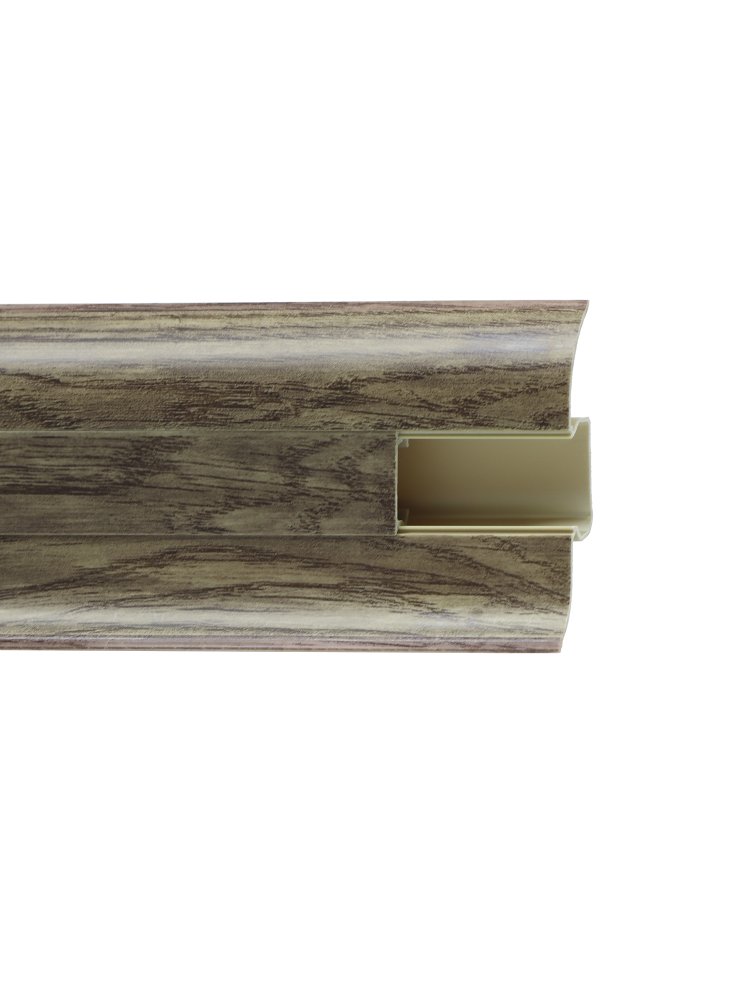 Утонченный и высокий профиль (58 мм) с острыми краями. Благодаря съёмной панели монтаж электрических проводов, покраска стен, оклеивание обоями возможны без демонтажа профилей. Конструкция позволяет монтировать и демонтировать плинтус без использования инструментов. Существует возможность размещения большого количества проводов, в том числе после монтажа. Специальная двухслойная технология: помимо слоя краски, дополнительно покрывается специальным лаком, благодаря чему его покрытие становится однородным, а это дополнительно защищает изделие от разного вида механических повреждений и вредного воздействия лучей УФ. Благодаря эластичному материалу, плинтус идеально прилегает даже к неровностям стен и полов. Внутренний уголок для плинтусов 58 мм, в цвете "Дуб Миланский", прочный ПВХ, устойчив к влаге и ударам, комплект 2 шт. для аккуратных стыков.