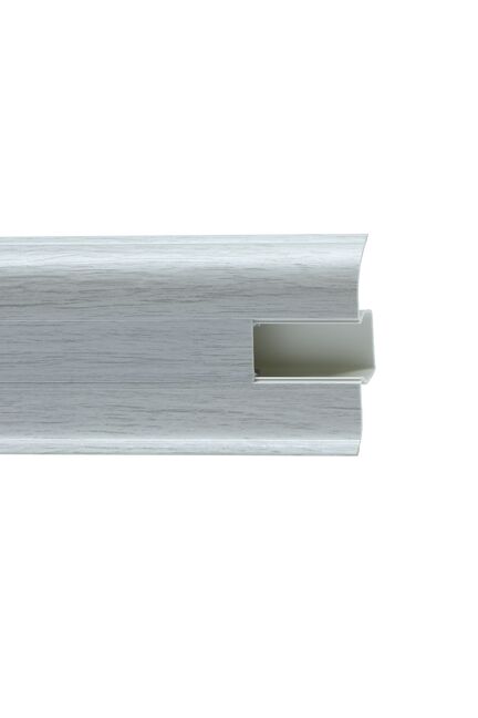 Утонченный и высокий профиль (58 мм) с острыми краями. Благодаря съёмной панели монтаж электрических проводов, покраска стен, оклеивание обоями возможны без демонтажа профилей. Конструкция позволяет монтировать и демонтировать плинтус без использования инструментов. Существует возможность размещения большого количества проводов, в том числе после монтажа. Специальная двухслойная технология: помимо слоя краски, дополнительно покрывается специальным лаком, благодаря чему его покрытие становится однородным, а это дополнительно защищает изделие от разного вида механических повреждений и вредного воздействия лучей УФ. Благодаря эластичному материалу, плинтус идеально прилегает даже к неровностям стен и полов.