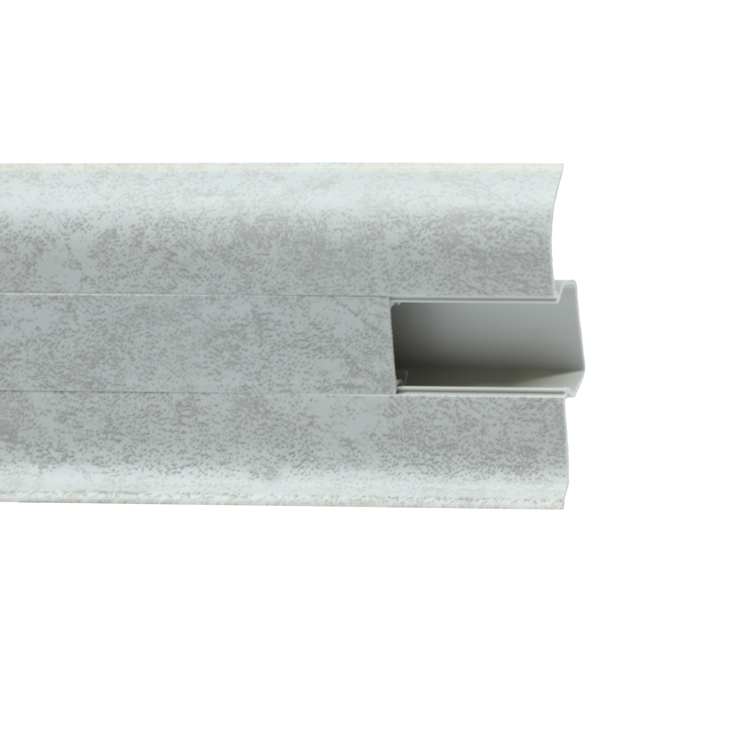 Утонченный и высокий профиль (58 мм) с острыми краями. Благодаря съёмной панели монтаж электрических проводов, покраска стен, оклеивание обоями возможны без демонтажа профилей. Конструкция позволяет монтировать и демонтировать плинтус без использования инструментов. Существует возможность размещения большого количества проводов, в том числе после монтажа. Специальная двухслойная технология: помимо слоя краски, дополнительно покрывается специальным лаком, благодаря чему его покрытие становится однородным, а это дополнительно защищает изделие от разного вида механических повреждений и вредного воздействия лучей УФ. Благодаря эластичному материалу, плинтус идеально прилегает даже к неровностям стен и полов.