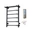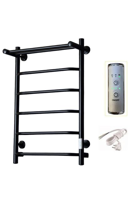 Изделие производится из углеродистой стали. Вертикальные трубы d-32 мм, для горизонтальных вставок используется труба d-18 мм. Нагревательным элементом в полотенцесушителе является греющий кабель — аналог «теплого пола», кабель заправляется внутрь каждой трубы и передает тепло на поверхность изделия. Во включенном состоянии постоянно поддерживается температура 50-60 градусов. Полотенцесушитель снабжен панелью управления. Кнопка включения/выключения и таймер на 2/4/6 часов , который позволяет включать изделие на ограниченное время. Эта функция дает возможность экономить электричество. Стильный черный полотенцесушитель 80×50 см, 6 перекладин, легко монтируется, быстро сушит бельё и предотвращает сырость в ванной.