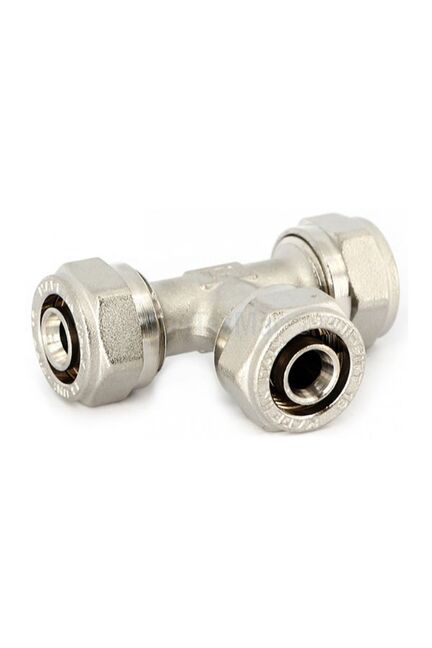 Прочный латунный тройник для металлопластиковых труб, никелирование, размер 16 мм, идеален для водоснабжения и отопления, устойчив к коррозии.