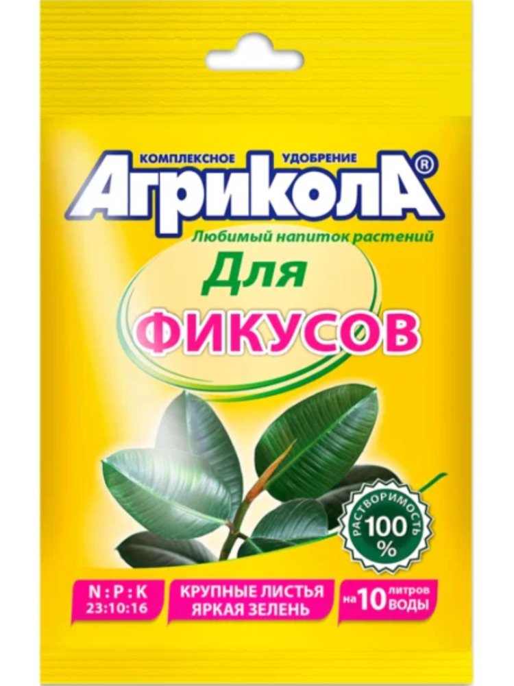 Быстрорастворимое удобрение ускоряет рост, придаёт яркость листве и укрепляет иммунитет фикусов. Лёгкость применения и экономный расход.