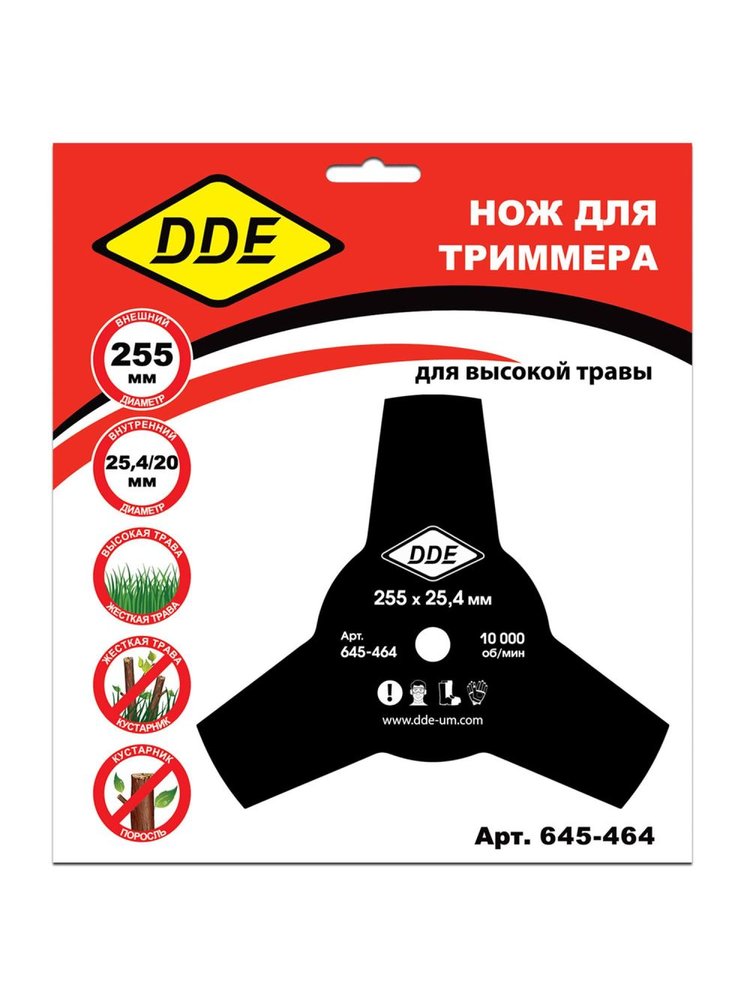 Диск для триммера DDE GRASS CUT 3-хлопастной, 255 х 25,4 мм, предназначен для кошения высокой травы. Изготовлен из углеродистой стали. Двухсторонняя заточка лезвий. Для равномерного износа рекомендуется переворачивать нож каждые 5 часов кошения. Регулярно затачивайте нож, после заточки обязательно проверяйте балансировку ножа. Рекомендуется для электрических и бензиновых триммеров с редуктором. Максимальные обороты 10 000. Толщина ножа 1,4 мм. Трёхлопастной стальной диск 255 мм, отверстие 25,4 мм для мотокос и триммеров. Эффективно режет траву и тонкие кустарники, служит долго.