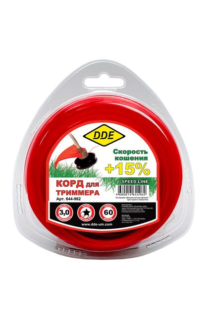 Триммерный корд DDE производится из материала сополимер-термопласт марки Luran S производимой мировым лидером, компанией BASF. Сечение-пятиконечная звезда. Звёздчатый корд 3,0 мм, 60 м, износостойкий, подходит для любой растительности, обеспечивает чистый срез и долгий срок службы без обрывов.