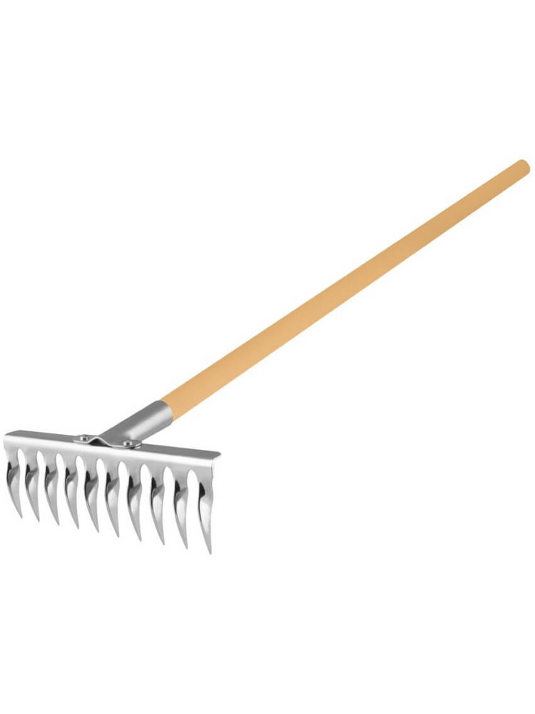 Надёжные и прочные грабли с 10 закалёнными витыми зубьями идеально подойдут для уборки листвы, выравнивания почвы и подготовки участка к посадке. Инструмент оснащён удобным длинным деревянным черенком, который облегчает работу и снижает нагрузку на спину.