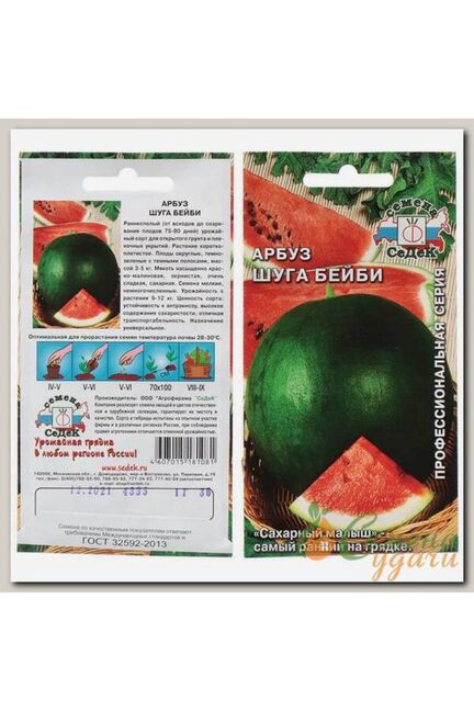 Семена арбуза Шуга Бейби 1 г от СеДеК – раннеспелый сорт, плоды 3-5 кг, сладкая мякоть, срок созревания 68-75 дней, устойчив к болезням.