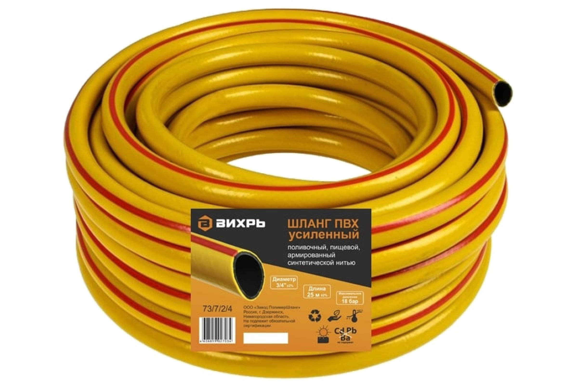 Прочный армированный шланг 25м, D 3/4'', толщина 1,85мм, не перекручивается, устойчив к давлению и ультрафиолету для полива и хозяйственных нужд.