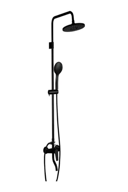 Душевая система в черном цвете с верхним и ручным душем, смесителем и антикоррозионным покрытием.