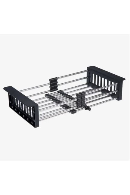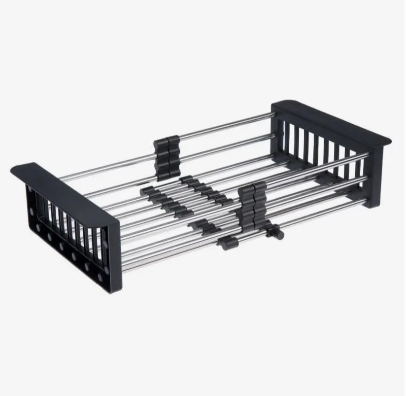Корзина из нержавеющей стали на кухонную мойку раздвижная для сушки столовых приборов , овощей и фруктов. Габаритные размеры: ширина 225 мм, длина от 310 до 440 мм.Подходит для квадратных моек Телескопический коландер с чашей 298-440 мм, крепится к мойке, экономит место и облегчает мойку продуктов. Прочный пластик графитового цвета.