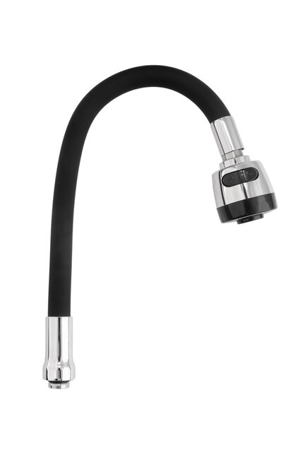 Материал: резиновый шланг в силиконовом шланге Цвет излива и насадки: чёрный Высота 35см Гарантия: 1 год Гусак с двухрежимной лейкой для кухонных смесителей: струя/душ, надежность, легкая установка, подходит для стандартных кранов.