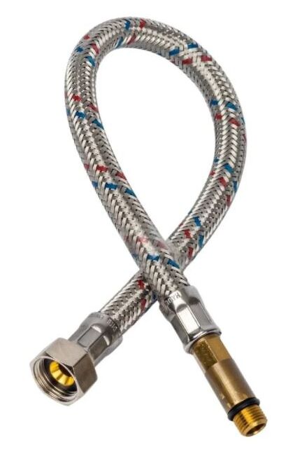 Гибкая прочная подводка длиной 50 см для подключения воды, устойчива к коррозии, легко монтируется, предотвращает протечки, универсальное применение.