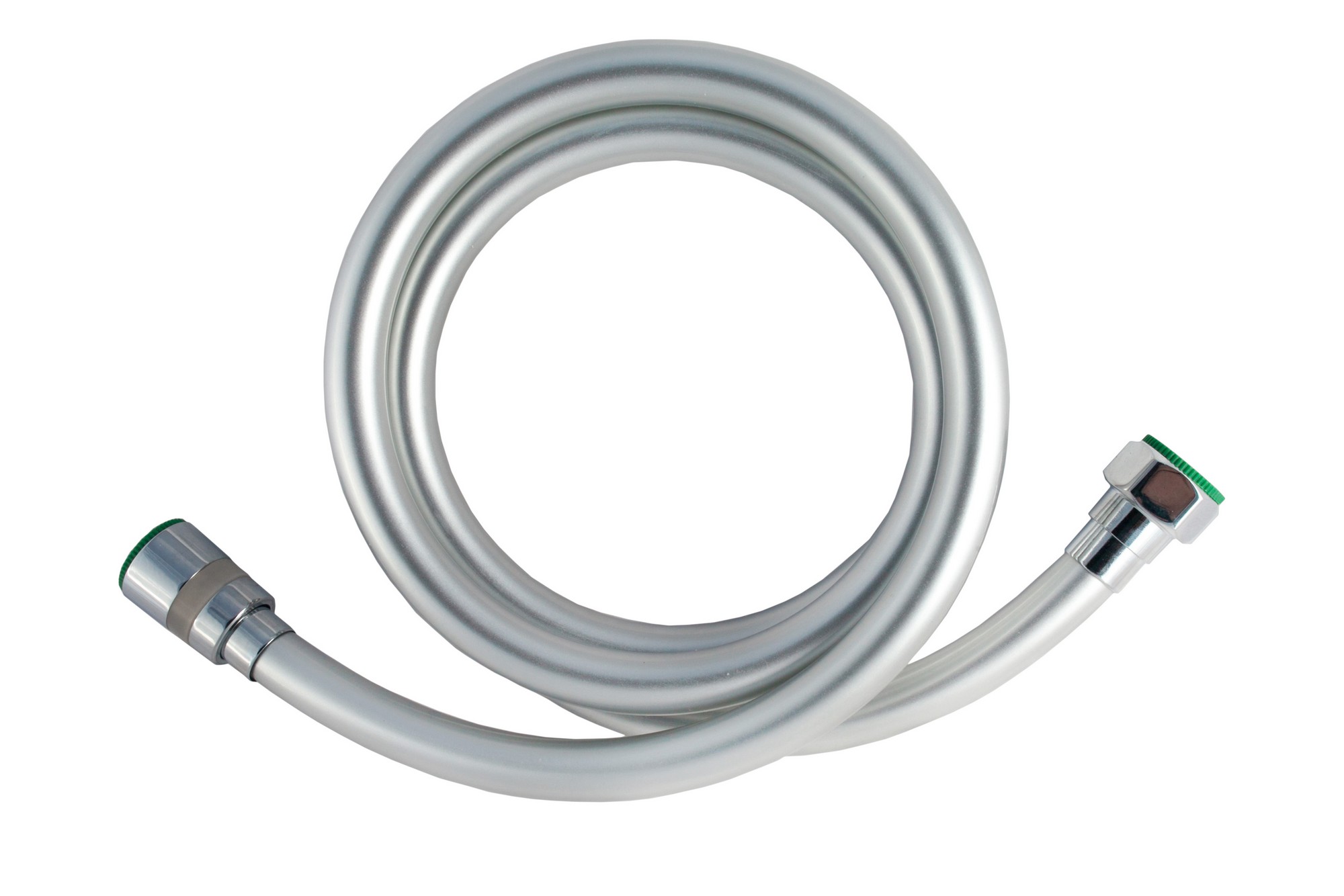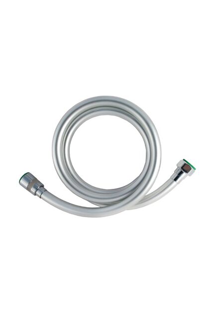 Материал: силикон с армированной сетчатой структурой. Длина - 150 см. Цвет - серебристый металлик. Рабочее давление воды: 0,3 МПа. Максимальное давление воды: 2 МПа. Максимальная температура воды: 80 гр. Гайки латунные. Сечение круглое Силиконовый шланг длиной 150 см с хромом, устойчив к заломам, стандартные соединения 1/2”, долговечен и подходит для любых душевых систем.