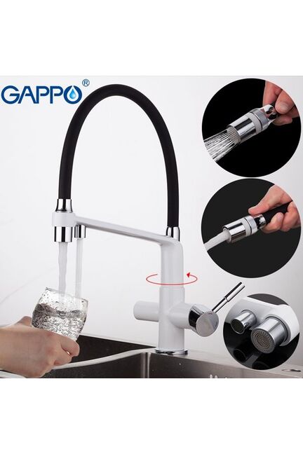 Смеситель д/кухни, GAPPO однорыч., канал д/фильтр.воды, черный гибкий излив, белый G4398-9