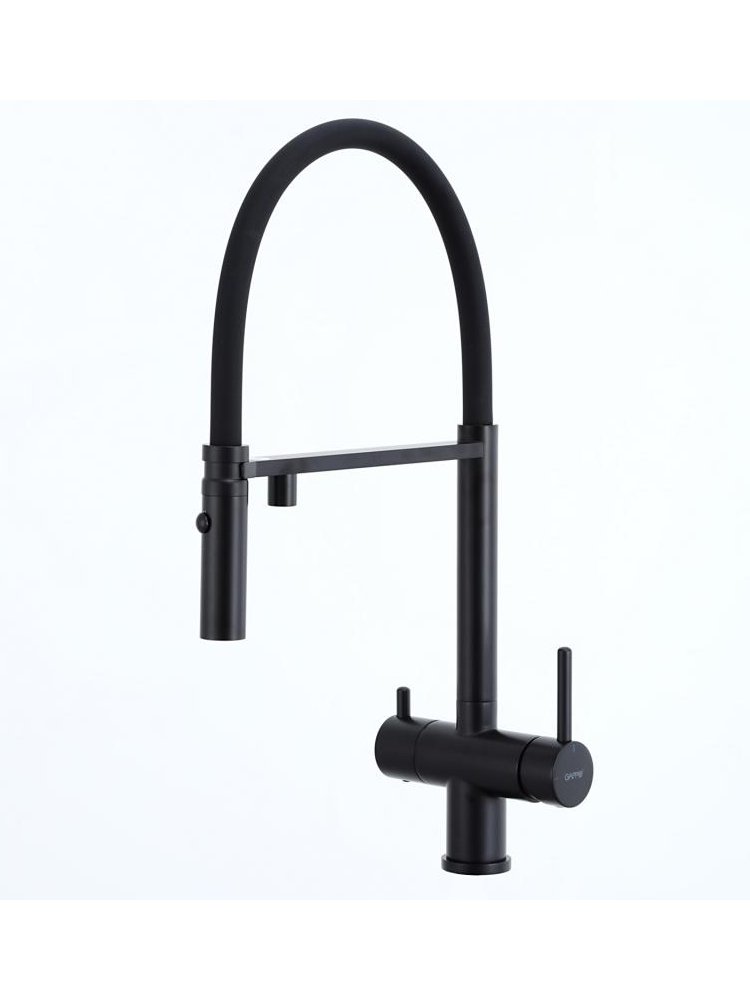 Современное решение для вашей кухни — однорычажный смеситель с черным гибким изливом и каналом для фильтрованной воды. Идеально подходит для установки на кухнях, где важны не только стиль, но и функциональность. Гибкий силиконовый излив обеспечивает удобство при наполнении крупных емкостей и мытье посуды, а отдельный канал для фильтрованной воды позволяет использовать один смеситель для обычной и питьевой воды без риска их смешивания.