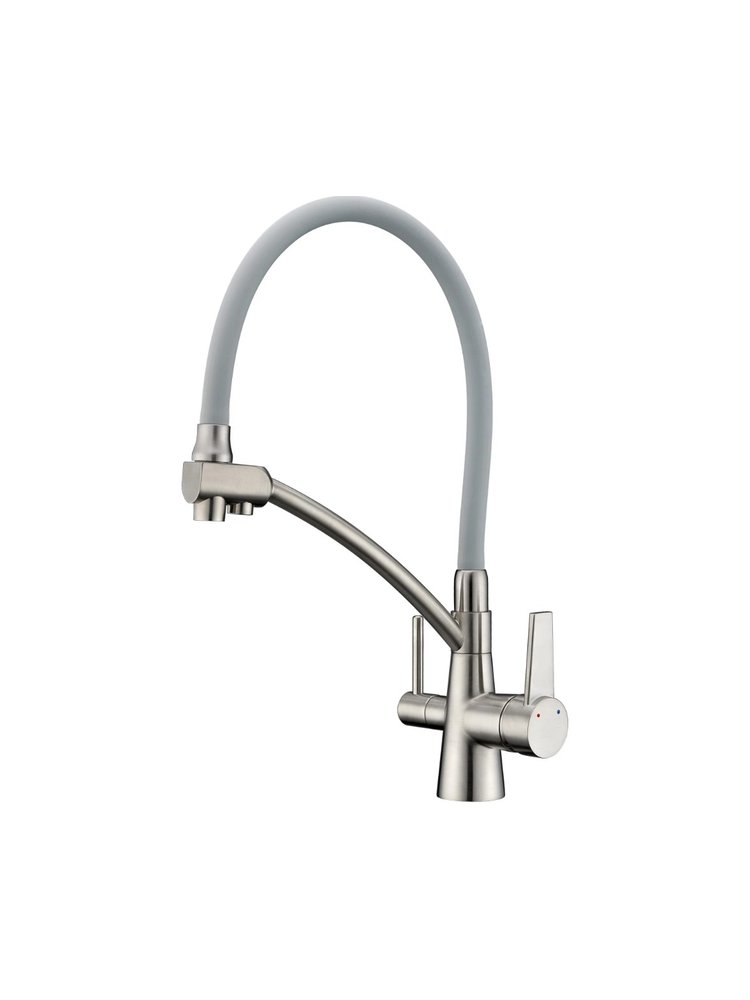 Стильный и долговечный смеситель с гибким серым изливом и отдельным каналом для фильтрованной воды — идеальное решение для современной кухни и заботы о чистоте питьевой воды. Продуманная конструкция обеспечивает эргономичность использования и экономию пространства, а устойчивое к коррозии сатиновое покрытие подчеркивает изысканный дизайн и долговечность.
