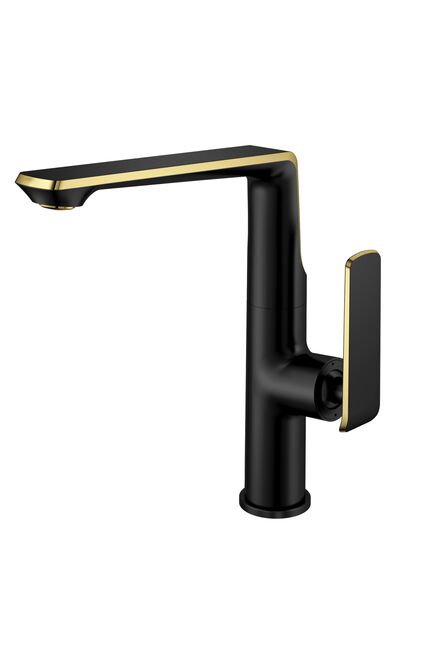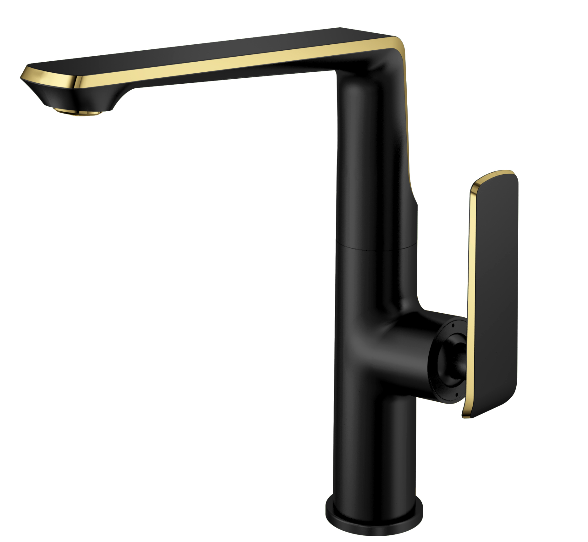 Корпус: высококачественная латунь; Покрытие: хром; Цвет: хром; Аэратор: G-eco; Керамический картридж: G-ceramic; Технология: TermoSAFE; Гарантия: 7 лет. Эргономичный кухонный смеситель: латунь, однорычажный механизм, устойчивое черно-золотое покрытие и высокий поворотный излив для максимального удобства.