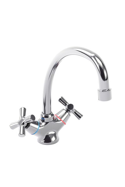 Двухвентильный кухонный смеситель из латуни с хромовым покрытием, высоким изливом, аэратором и надежной фурнитурой, для удобства в быту.