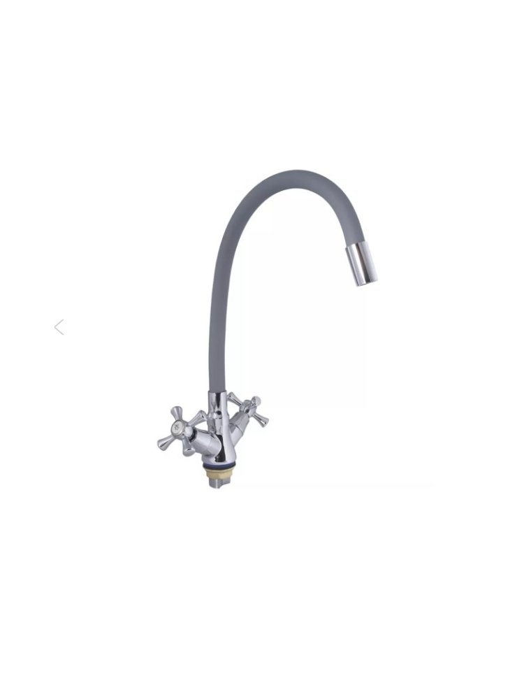 Практичный двухвентильный смеситель с гибким серым гусаком идеально подходит для современной кухни — упрощает мытьё крупных кастрюль, посуды и овощей благодаря высокой маневренности излива.