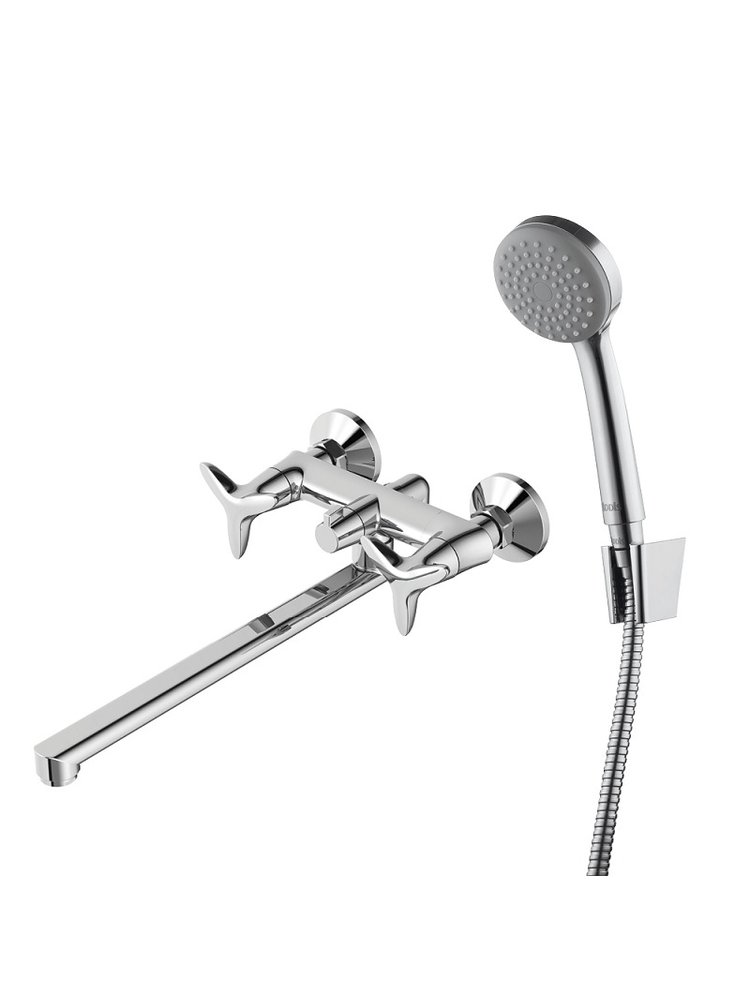 Двуручный смеситель для ванны с латунным корпусом, хромированием, изливом 30 см, керамическим картриджем и без душевого комплекта.