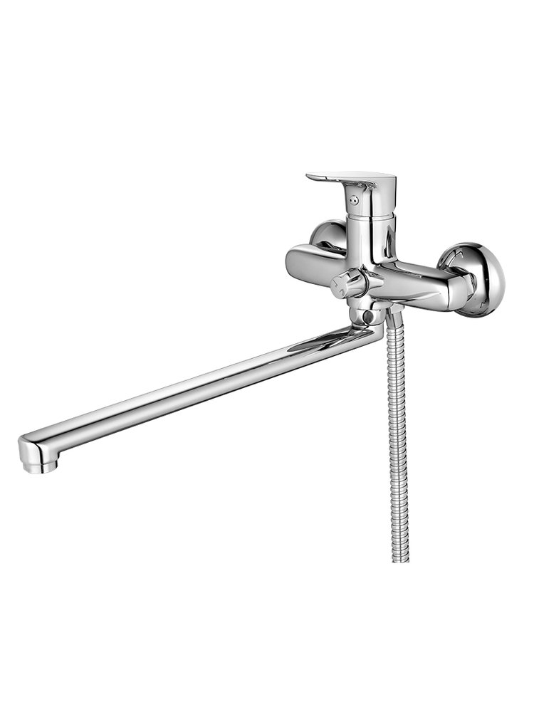 Однорычажный смеситель с длинным изливом 35 см, керамическим картриджем, хромовым покрытием, в комплекте душевой гарнитур, плавная регулировка.