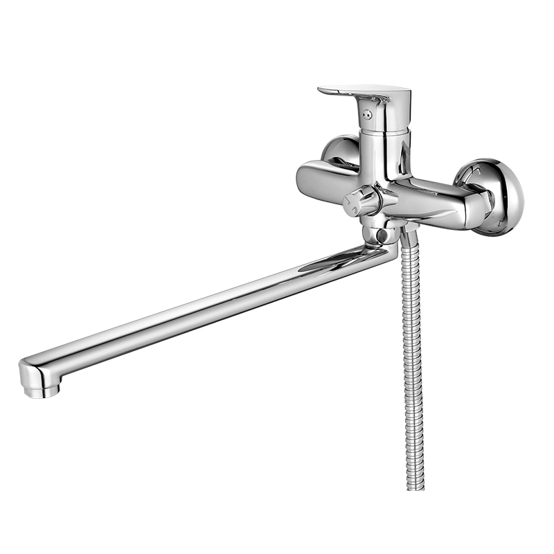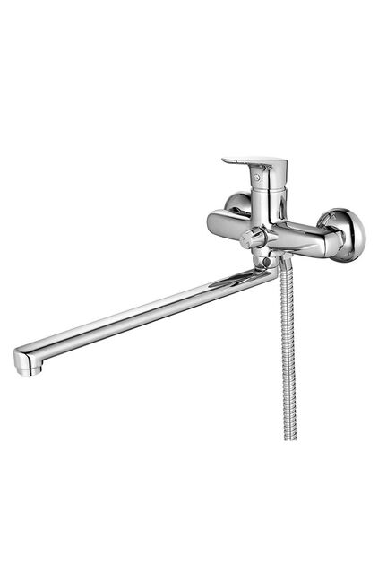 Однорычажный смеситель с длинным изливом 35 см, керамическим картриджем, хромовым покрытием, в комплекте душевой гарнитур, плавная регулировка.