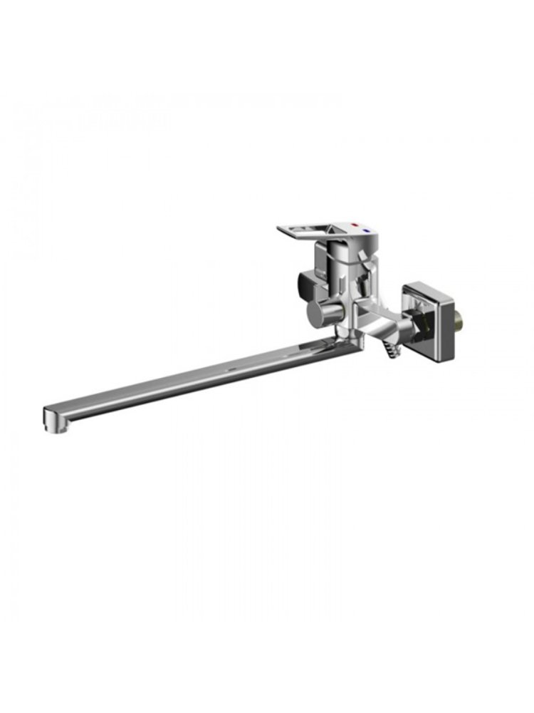 Однорычажный смеситель, латунь с хромом, керамический картридж, длина излива 38,5 см, настенный монтаж, для ванны и душа.