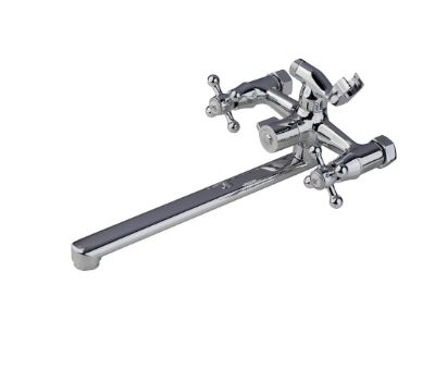 Практичный двуручный смеситель с L-гусаком 30 см, удобный для ванной и раковины, из латуни с антикоррозийным покрытием, для настенного монтажа.