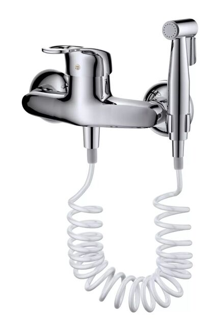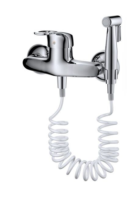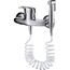Комплект настенного смесителя с гигиеническим душем: надежная латунь, хром, плавная регулировка. Для комфорта и экономии пространства.