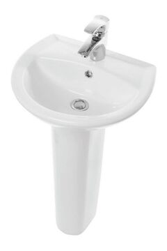 Компактный фарфоровый умывальник с пьедесталом, легко монтируется, устойчив к царапинам и воздействию химии, скрывает коммуникации.