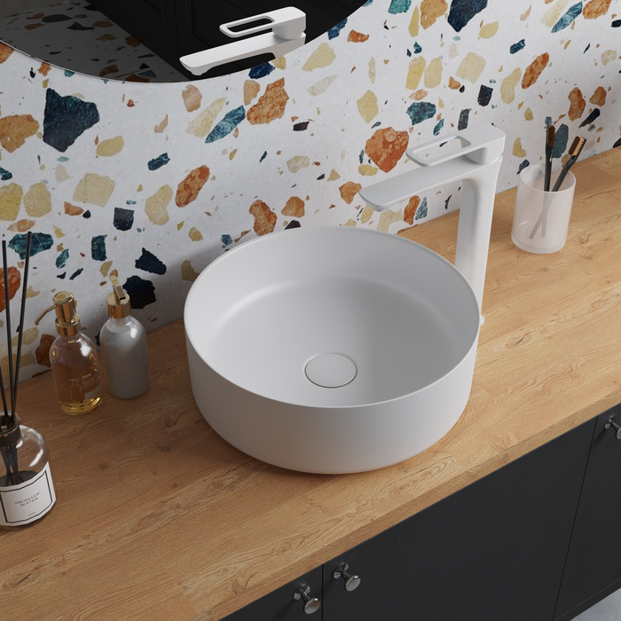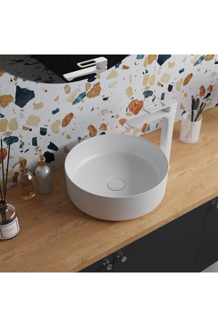 Компактный умывальник 355×355×120 мм, керамика, белый, накладная установка, стильный дизайн, прост в уходе, подходит для любой ванной комнаты.